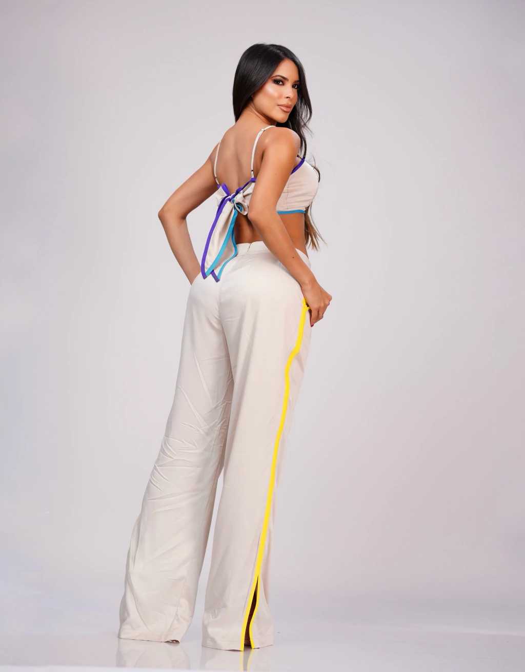 Descubre el Sahara Set, un conjunto diseñado especialmente para quienes buscan un outfit que combine estilo, comodidad y un toque único. Este set incluye un pantalón y un crop top en un elegante color beige, adornados con sesgos de colores que aportan un diseño exclusivo y lleno de vida.